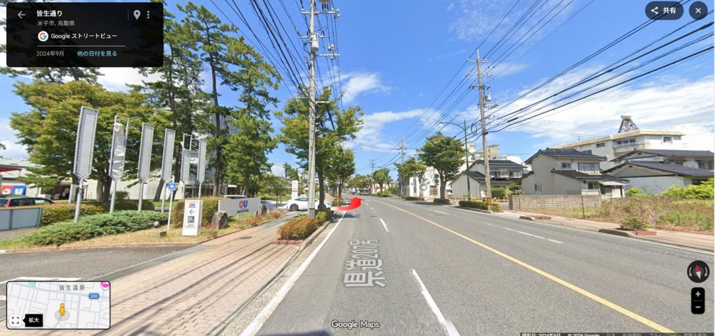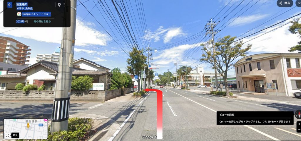 東に向かい、120m進んだところの、信号のある交差点を左折する。