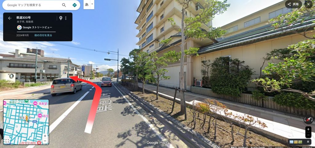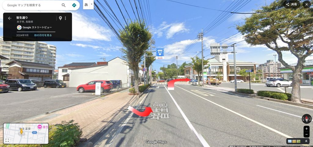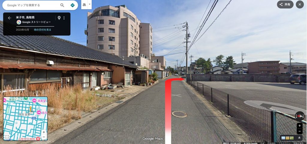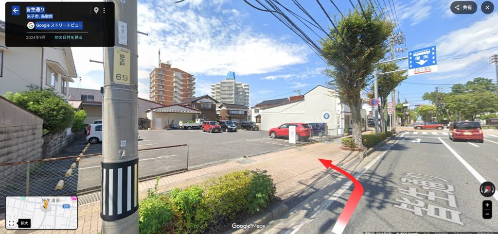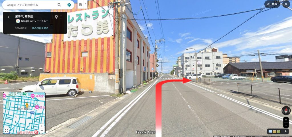東に向かい、60m進んだところ右折して、駐車場に入る。
